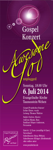 Bald ist es wieder soweit, die Sängerinnen und Sänger von Rejoice! sind voller Vorfreude auf das nächste Konzert mit Rejoice! – dem Taunussteiner Gospelchor. “Wir wollen mit dem Publikum ein großes Gospelfest feiern” so Chorleiter Thomas Wächter, der für das Programm wieder viele spannende Titel zusammengestellt hat, unter anderem das a capella-Stück “Awesome God” des deutschen Komponisten und Chorleiters Nico Schlenker, das dem Programm seinen Namen gibt.