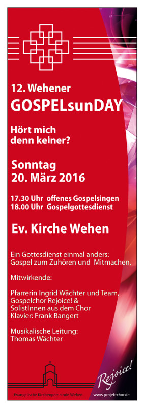Die Ev. Kirchengemeinde Wehen und der Gospelchor Rejoice! laden zu einem weiteren Gottesdienst der neuen Reihe GOSPELsunDAY ein:
